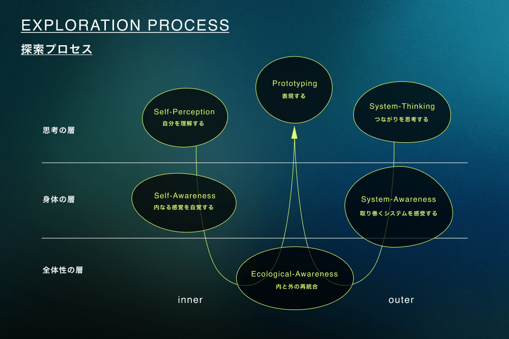 では、具体的にどのような探索の旅路を辿ったのか。そのプロセスは、大きく5つのフェーズに分けられ、この間を行き来しながら、今回の展示という「途中経過の発表」に至った。共催者である一般社団法人Ecological Memes代表・小林泰紘氏の解説をもとにその旅路を追いかけてみよう。