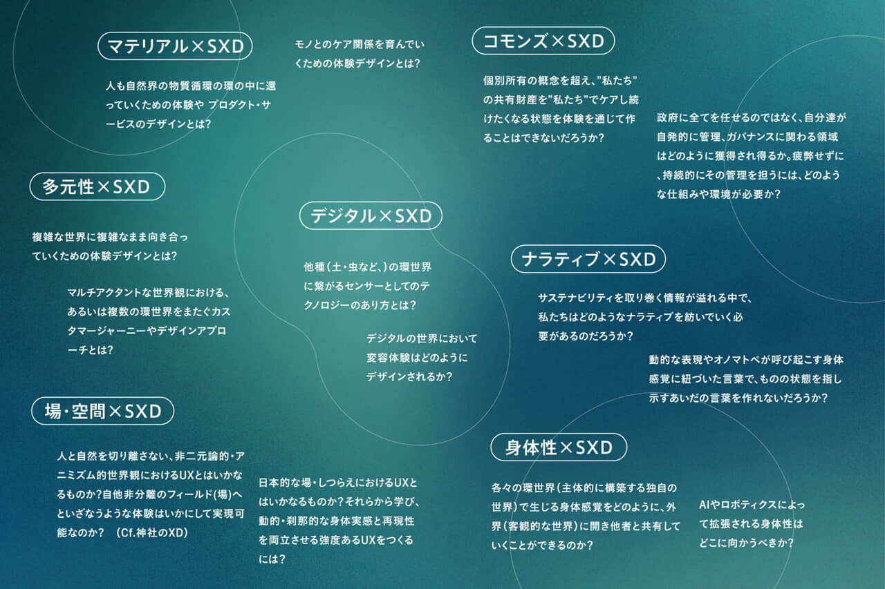 そんなSXD Labが実施した7ヶ月間の探索プログラムの参加者は、「そもそもデザインとは何か?」「複雑な世界に複雑なまま向き合っていくための体験デザインとは?」「他種の環世界に繋がるセンサーとしてのテクノロジーのあり方とは?」などのガイドとなる問いに触れながら、サステナビリティやリジェネレーションを取り巻く価値観や行動変容を生む体験デザインの可能性を探求してきた。