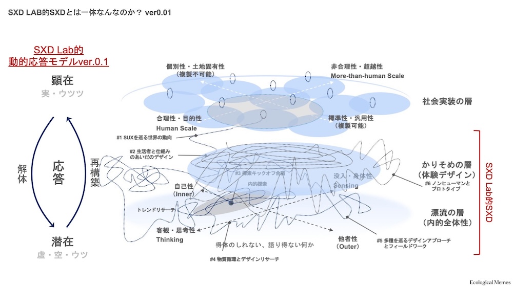 このようなSXD Labでの探索を講師陣が改めて見つめ直し、小林氏は、その道のりがこの図のように、重なる層を縦横無尽に行き来するプロセスだったと振り返った。