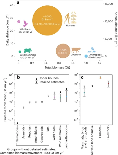 人類が移動によって動かす生物的質量(=体重×移動距離)は、年間で約4,000ギガトン・キロメートル。これは野生動物全体の動きをはるかに凌駕する数字である。さらに、1850年以降の約170年間で、人間の移動量は40倍以上に増加した一方、海洋生物の移動量は産業漁業や捕鯨の影響で約60%減少している。