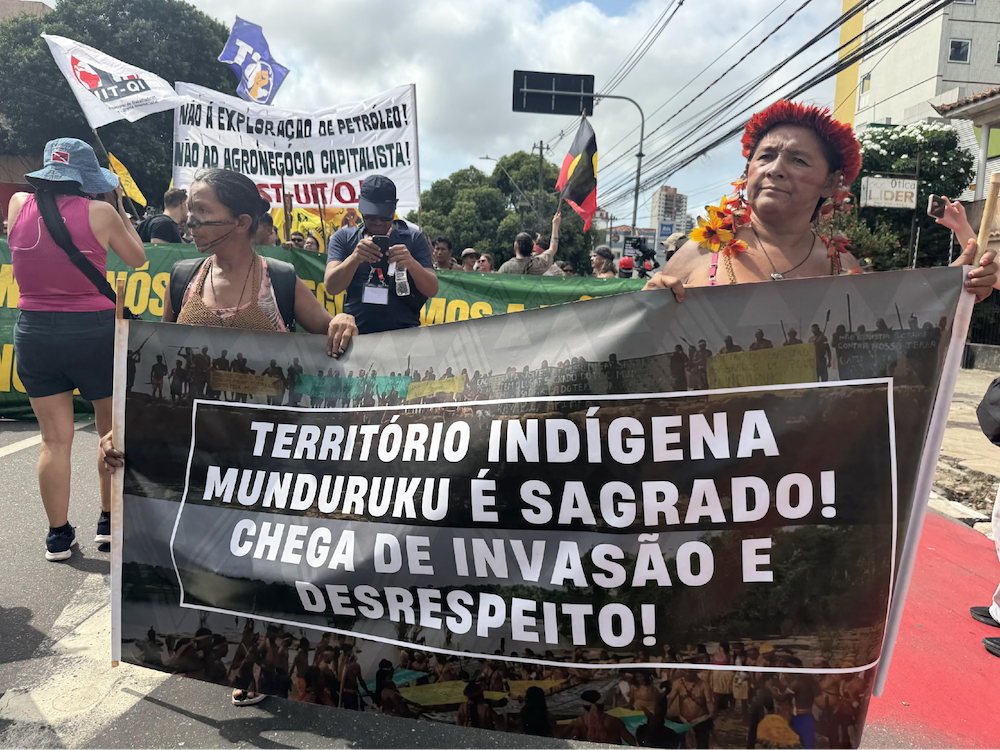 それは7万人が参加した気候マーチでも、中心に掲げられたメッセージだった。行進には、先住民族、伝統的コミュニティ、農民グループ、労働団体、さらにはパレスチナ問題に声を上げる参加者まで、多様な人々が加わっていた。ブラジルの抗議行動でお馴染みの太鼓のリズムに、先住民族の象徴であるマラカス、地元音楽のカリンボーが重なる。