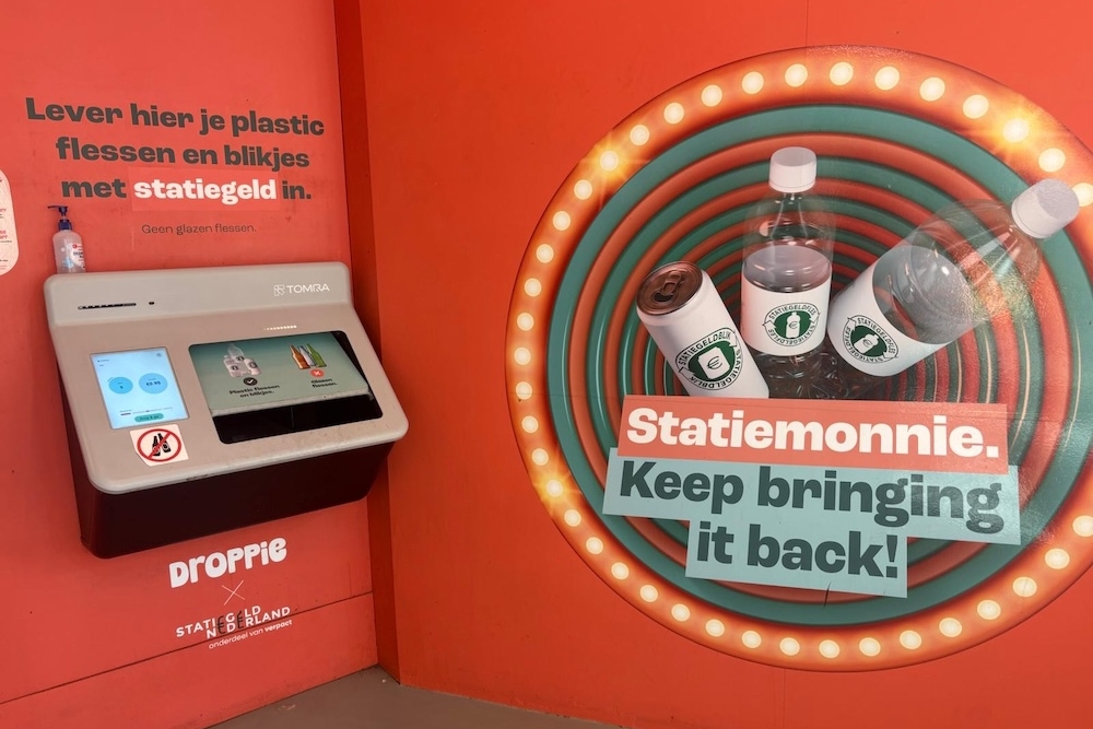 背景には、オランダで広く導入されている拡大生産者責任(EPR)制度の存在がある。飲料メーカーや小売事業者が、使用後の容器の回収責任を負う仕組みで、デポジット(0.15〜0.25ユーロ、約27〜45円)が価格に自動的に上乗せされ、スーパーの回収機に返すと返金される。包装材全体の回収・再資源化はVerpactという民間主導の団体が担い、国全体の循環システムを下支えしている。