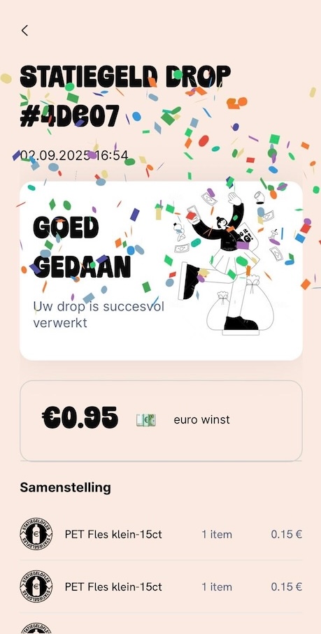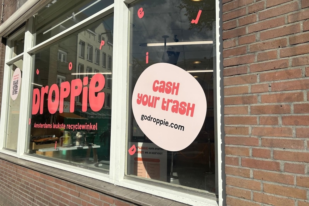 Droppieは2024年、アムステルダム西部に実店舗をオープンした。ペットボトル、缶、衣類、小型家電、紙容器など、ごく日常的に生まれる多様な資源を“ドロップ(置いていく)”すると、オンライン振り込みによる「報酬」が受け取れる。