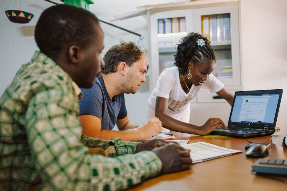 Chief Tree Planting OfficerのPieter van Midwoud(中央)がブルキナファソの植樹パートナーと話している様子|Image via Ecosia
