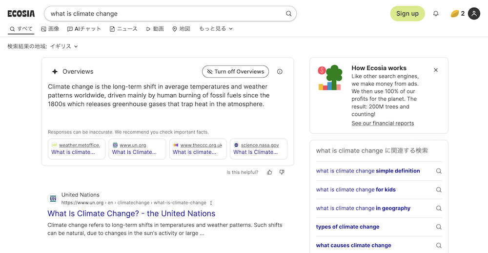 検索結果の地域をイギリスに設定して表示されたEcosiaのAI要約の様子。日本語版ではこれが日本語でも表示される見込み。「Turn off Overviews」をクリックすればすぐにAI要約をオフにできる。