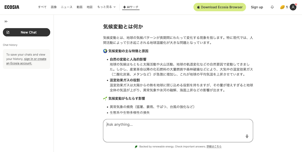 そんな中、同社は2025年2月「世界で最もグリーンなAI」の試験運用を発表した。いかにして環境負荷を抑えたAIを実装したのか。その背景と、EcosiaならではのAI機能の特徴について聞いた。