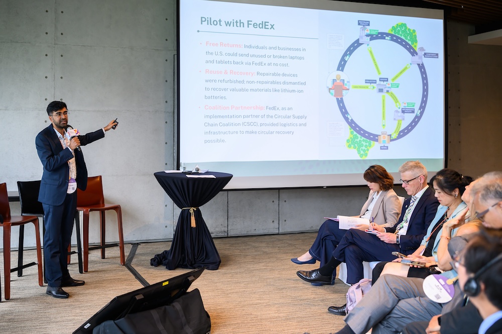 一つは、アメリカで配送会社のFedExと協業した循環型物流の取り組み。FedExは「配送後の空の輸送便を有効活用できないか」という問題意識を持っていた。そこで、配送を終えたFedExが顧客から使用済みのノートパソコンを無料で回収し、修理を担うパートナー組織に届け、修理・再生する枠組みが実現した。修理できないものは重要鉱物を抽出することで資源を回収できたそうだ。
