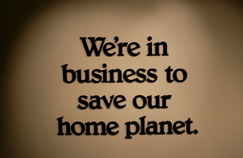 店内の壁に漆塗りで書かれているパタゴニアの標語「地球を救うためにビジネスを営む」。
