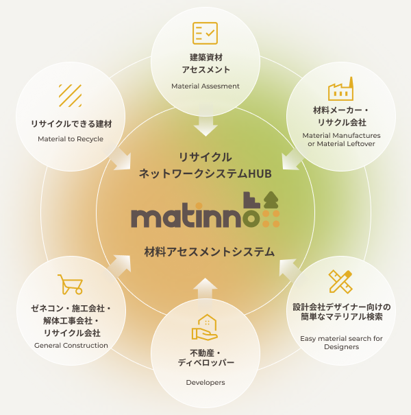 matinnoは、素材メーカー、建築家、設計者、施工会社、リサイクル事業者など、建設バリューチェーンに関わる多様なプレイヤーをつなぐことを目的としたプラットフォームだ。