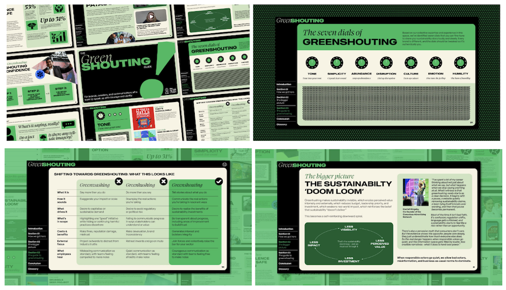 だからこそ重要となるのが、グリーンウォッシングにならない誠実な情報発信の方法を見出すこと。その指針の一つとなるのが、2026年3月末、クリエイティブ業界の気候変動アクションを支援する非営利団体・Creatives for Climateと、B Corp認証の運営組織・B Labが共同で公開したガイド『GreenSHOUTING Guide』だ。