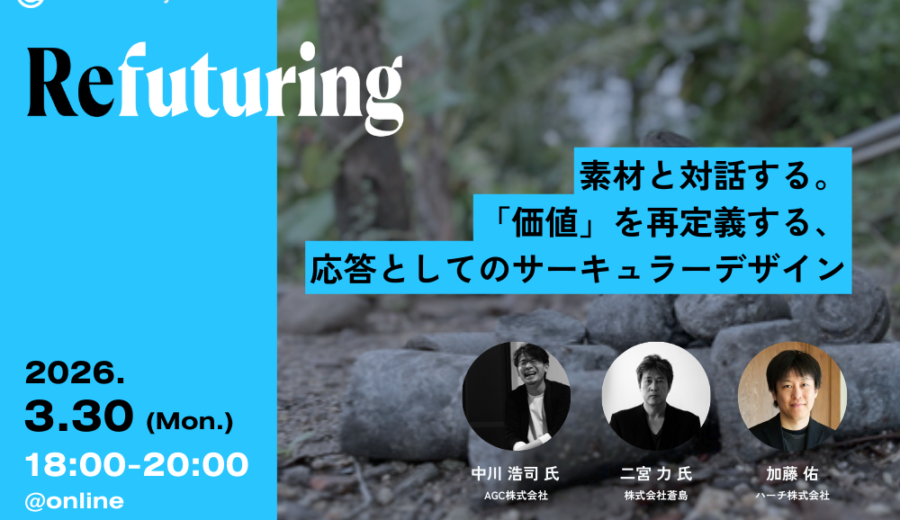 Circular Economy Hubがお届けするオンラインイベントシリーズ「Refuturing(リフューチャリング)」。2026年3月のテーマは、「素材と対話する:「価値」を再定義する、応答としてのサーキュラーデザイン」です。